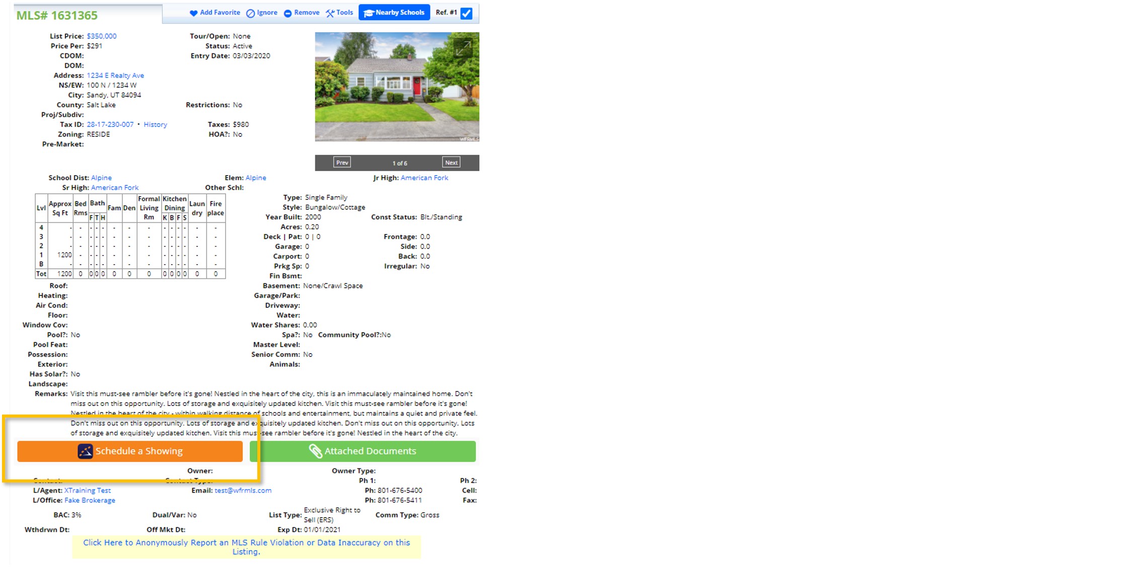 • Agent Full & Medium Reports: Click the Schedule a Showing button that appears on the Agent Full Report and the Agent Medium Report. This button will appear at the bottom of the reports, near the contact information for the listing agent.
