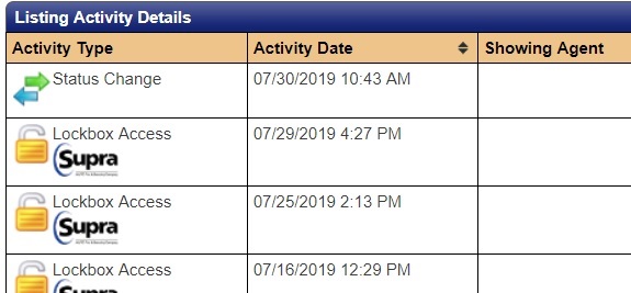 3. On the Listing Activity Report, you will see a section called Listing Activity Details, which will show all ShowingTime showing activity associated with the listing, including Supra lockbox access history.