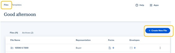 1. Under the Files tab of the main navigation menu of SkySlope Forms, select +Create New File.