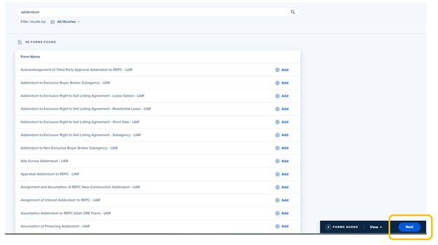 9. Click the Add option next to all forms you want to add to the file.
