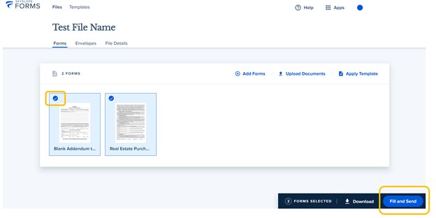 12. Click the checkboxes that appear next to each form to select the Forms that you would like to prepare for signature, then select the Fill and Send option.