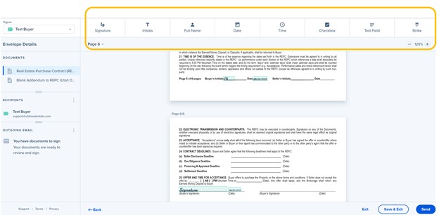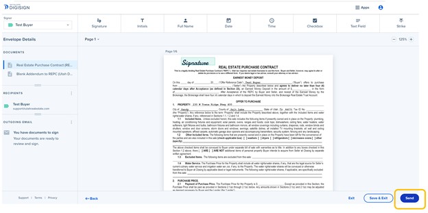 19. Select Send in the lower right corner when the document is ready to be sent for signature.