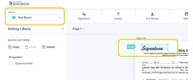 18. If additional actions are needed, such as if a specific person needs to initial or sign in a custom location, make sure to use the Signer dropdown menu option to select the correct person who needs to take the necessary action before you add any additional signature or initial fields.