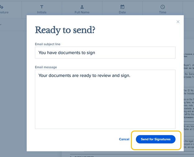 20. Last, optionally enter a custom email subject and message to be sent along with the documents and select Send for Signatures.