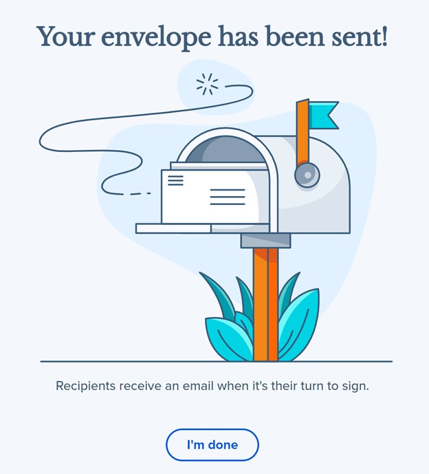 This is the confirmation page you will see once your Forms Envelope has successfully been sent for signature: